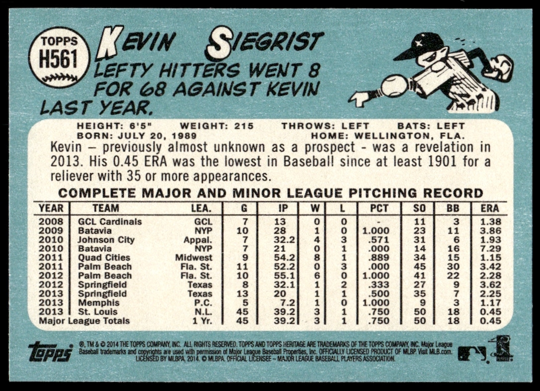 This Baseball card, from 2014 is part of the Topps Heritage High Number card set. Kevin Siegrist is featured and has a card number of H561.