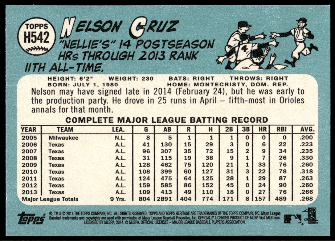 This Baseball card, from 2014 is part of the Topps Heritage High Number card set. Nelson Cruz is featured and has a card number of H542.