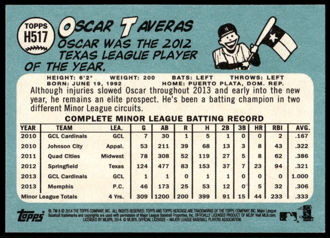 This Baseball card, from 2014 is part of the Topps Heritage High Number card set. Oscar Taveras is featured and has a card number of H517.