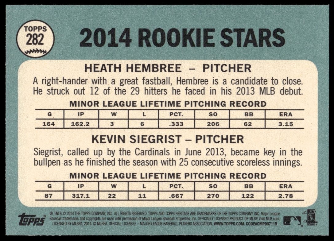 This BaseballΒ card, from 2014 is part of the Topps HeritageΒ card set. Kevin Siegrist / Heath Hembree is featured and has a card number of 282.