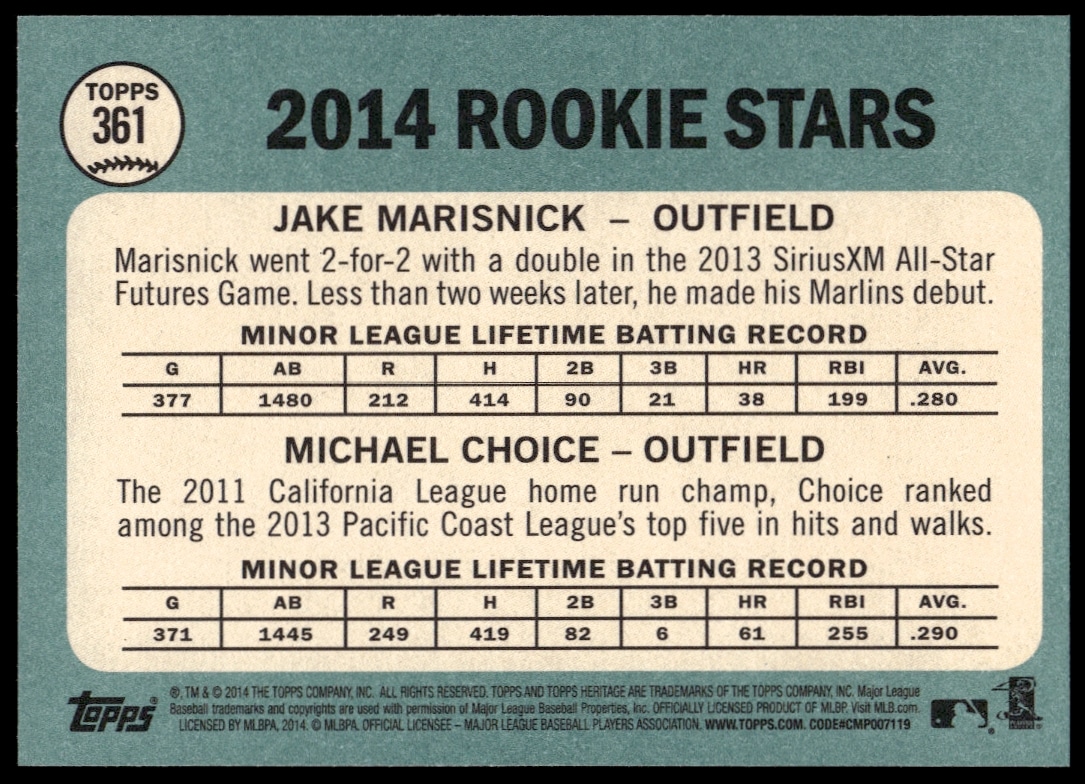 This BaseballΒ card, from 2014 is part of the Topps HeritageΒ card set. Michael Choice / Jake Marisnick is featured and has a card number of 361.