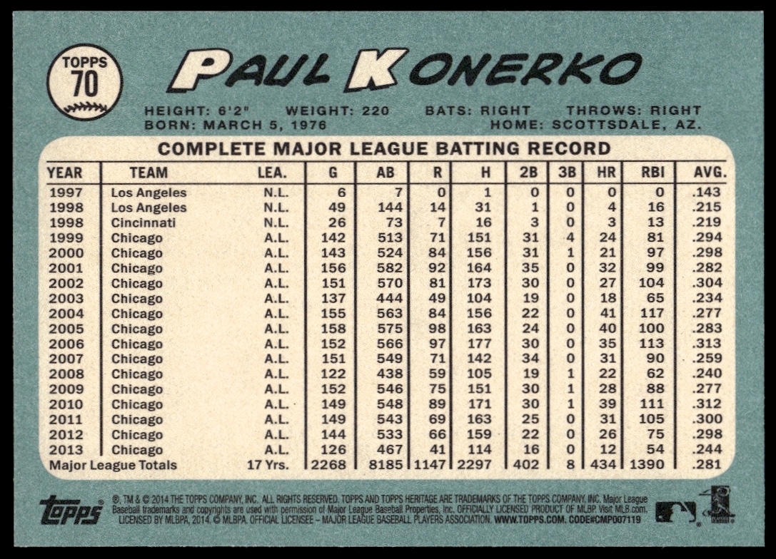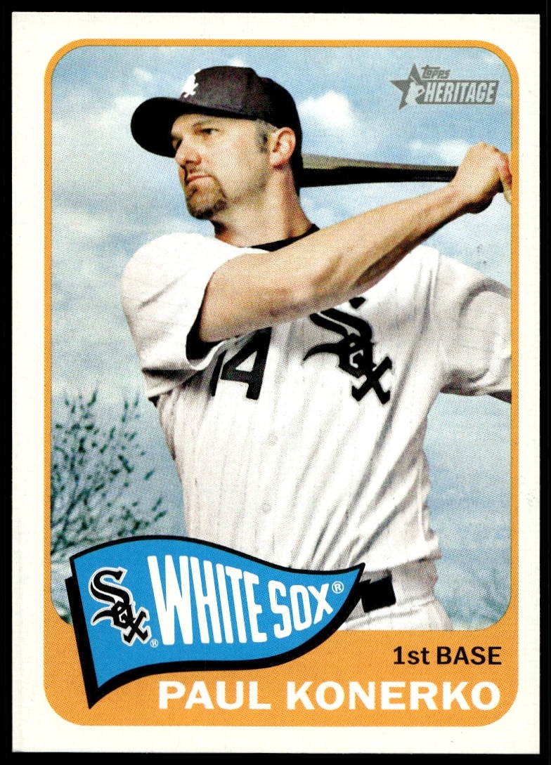 This BaseballΒ card, from 2014 is part of the Topps HeritageΒ card set. Paul Konerko is featured and has a card number of 70.