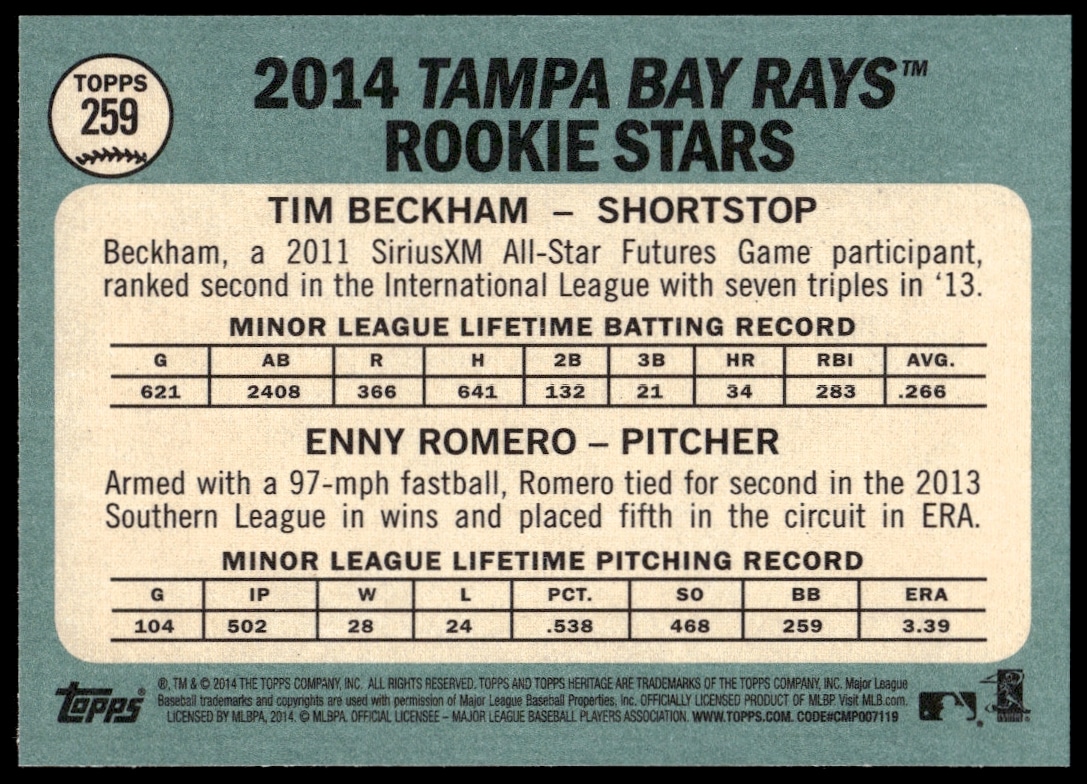 This BaseballΒ card, from 2014 is part of the Topps HeritageΒ card set. Tim Beckham / Enny Romero is featured and has a card number of 259.
