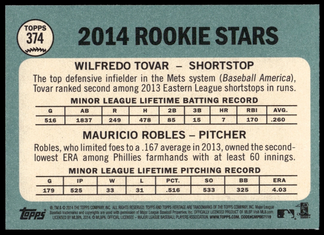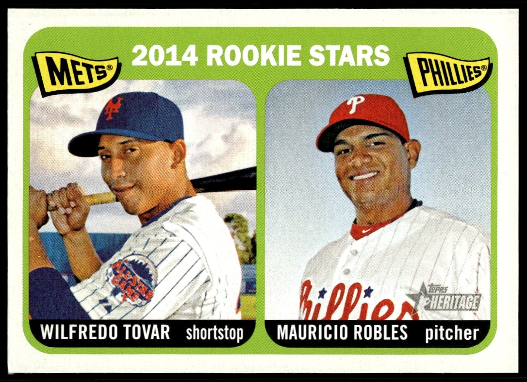 This BaseballΒ card, from 2014 is part of the Topps HeritageΒ card set. Wilfredo Tovar/ Mauricio Robles is featured and has a card number of 374.