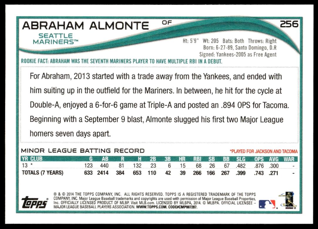 This Baseball card, from 2014 is part of the Topps Series 1 card set. Abraham Almonte is featured and has a card number of 256.