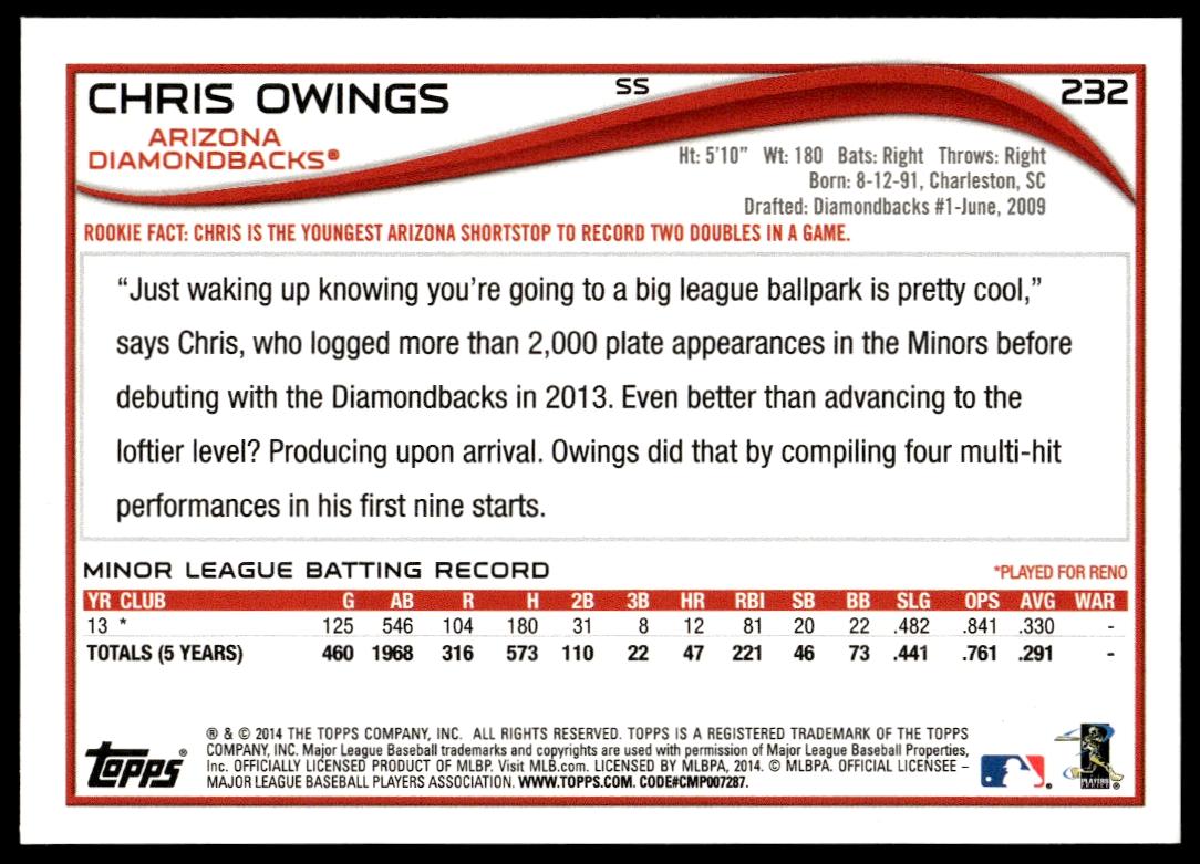 This BaseballΒ card, from 2014 is part of the Topps Series 1Β card set. Chris Owings is featured and has a card number of 232.