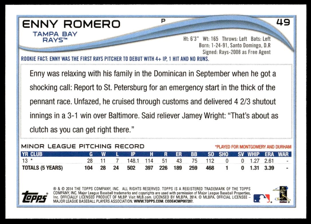 This BaseballΒ card, from 2014 is part of the Topps Series 1Β card set. Enny Romero is featured and has a card number of 49.