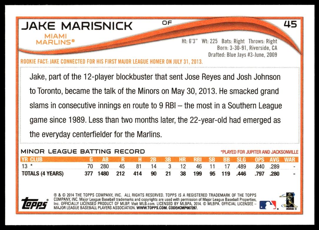 This BaseballΒ card, from 2014 is part of the Topps Series 1Β card set. Jake Marisnick is featured and has a card number of 45.