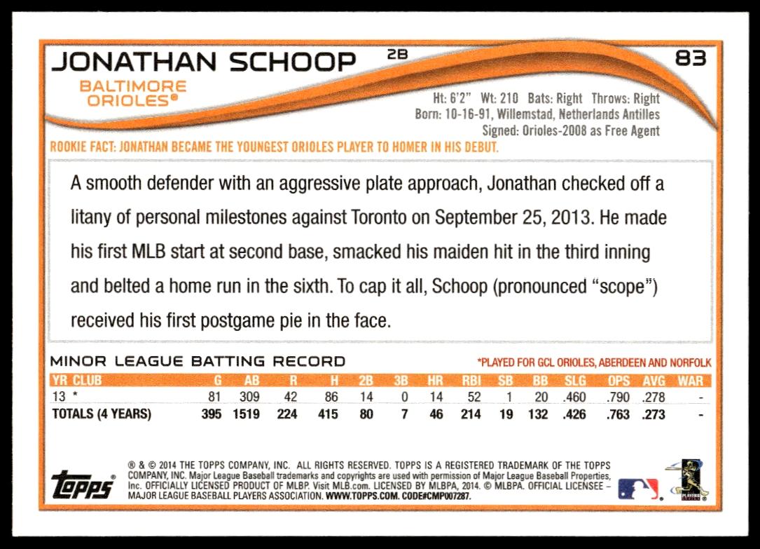 This BaseballΒ card, from 2014 is part of the Topps Series 1Β card set. Jonathan Schoop is featured and has a card number of 83.