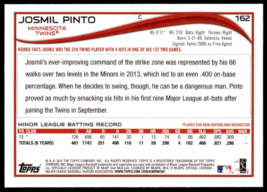 This BaseballΒ card, from 2014 is part of the Topps Series 1Β card set. Josmil Pinto is featured and has a card number of 24.