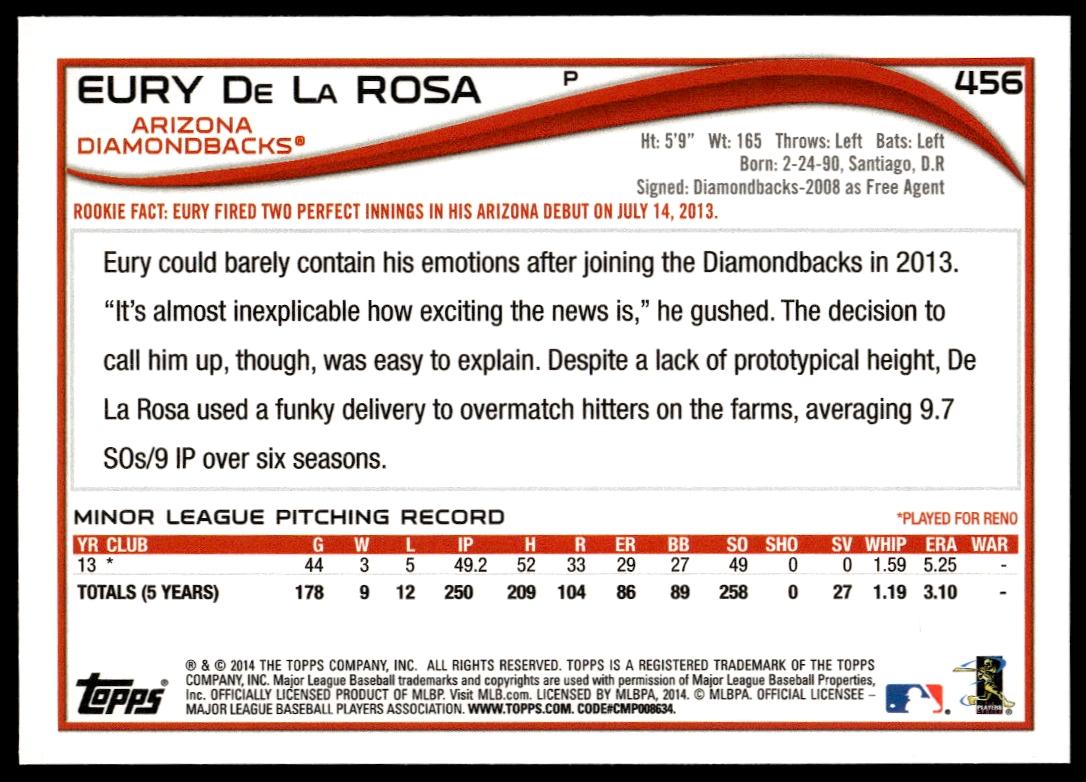 This BaseballΒ card, from 2014 is part of the Topps Series 2Β card set. Eury De La Rosa is featured and has a card number of 456.