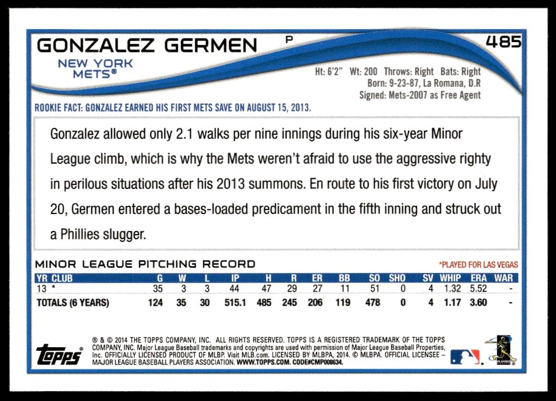 This BaseballΒ card, from 2014 is part of the Topps Series 2Β card set. Gonzalez Germen is featured and has a card number of 485.