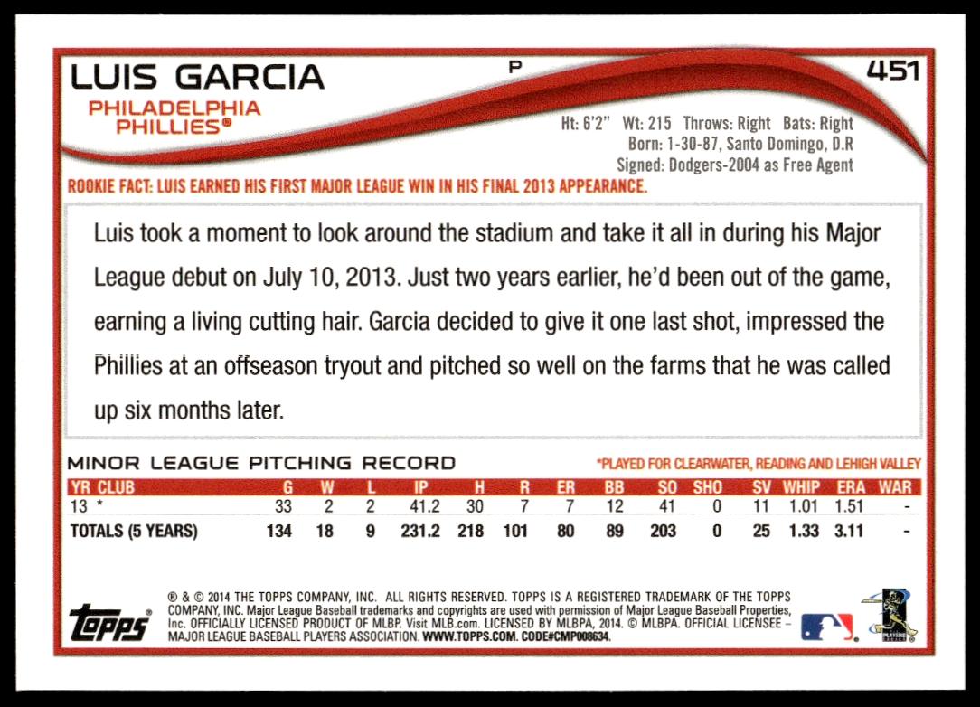 This BaseballΒ card, from 2014 is part of the Topps Series 2Β card set. Luis Garcia is featured and has a card number of 451.