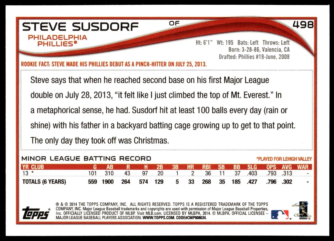 This BaseballΒ card, from 2014 is part of the Topps Series 2Β card set. Steve Susdorf is featured and has a card number of 498.