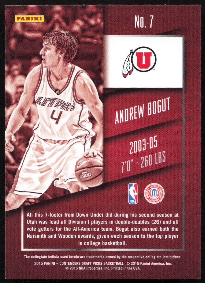 This Basketball card, from 2015-16 is part of the Panini Contenders Draft Picks card set. Andrew Bogut is featured and has a card number of 7.