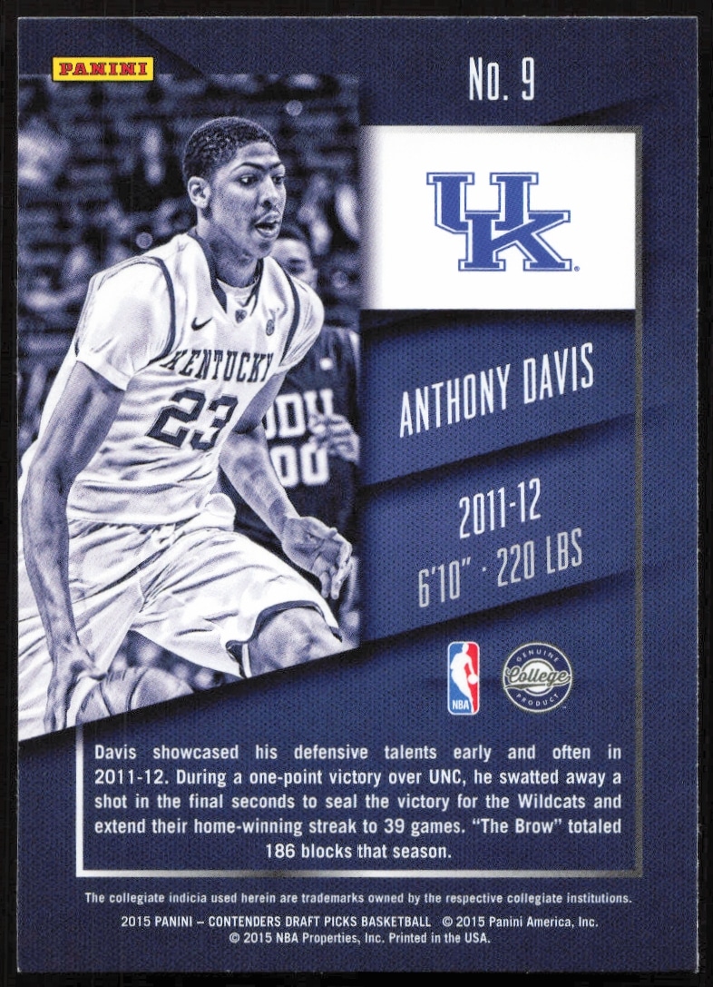 This Basketball card, from 2015-16 is part of the Panini Contenders Draft Picks card set. Anthony Davis is featured and has a card number of 9.