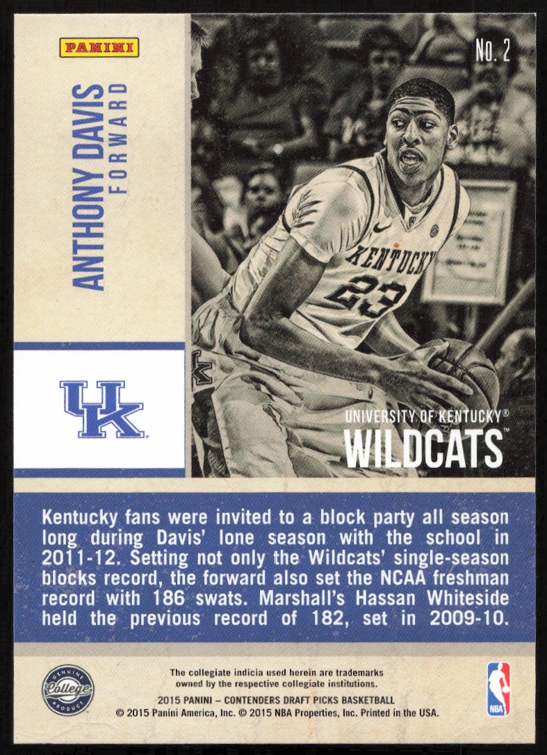 This Basketball card, from 2015-16 is part of the Panini Contenders Draft Picks card set. Anthony Davis is featured and has a card number of 2.