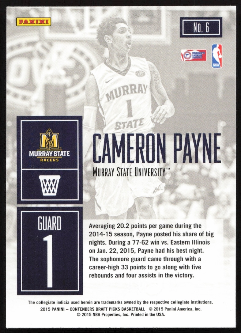 This Basketball card, from 2015-16 is part of the Panini Contenders Draft Picks card set. Cameron Payne is featured and has a card number of 6.