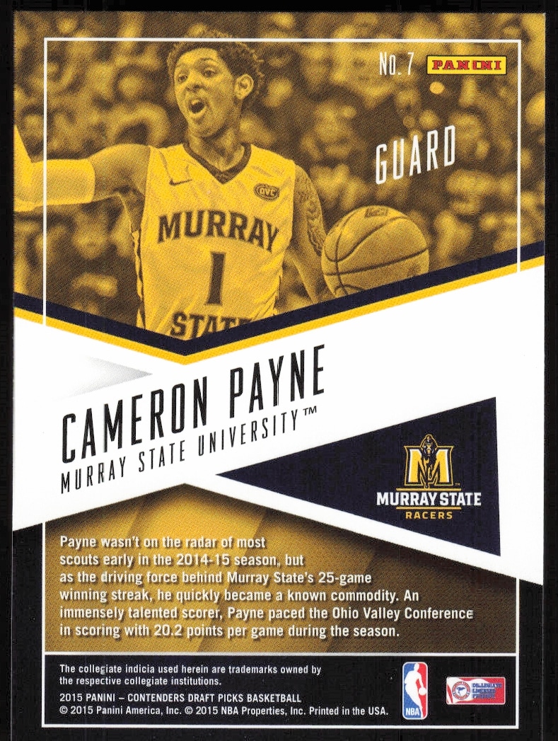 This Basketball card, from 2015-16 is part of the Panini Contenders Draft Picks card set. Cameron Payne is featured and has a card number of 7.