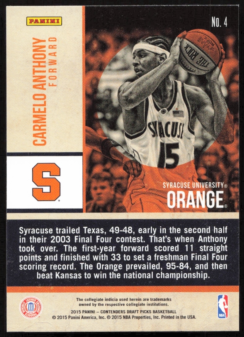 This Basketball card, from 2015-16 is part of the Panini Contenders Draft Picks card set. Carmelo Anthony is featured and has a card number of 4.