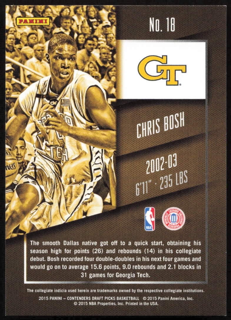This Basketball card, from 2015-16 is part of the Panini Contenders Draft Picks card set. Chris Bosh is featured and has a card number of 18.