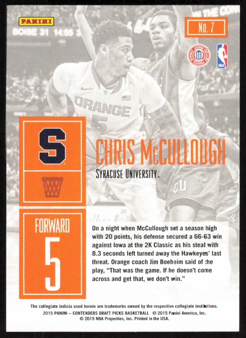 This Basketball card, from 2015-16 is part of the Panini Contenders Draft Picks card set. Chris McCullough is featured and has a card number of 7.