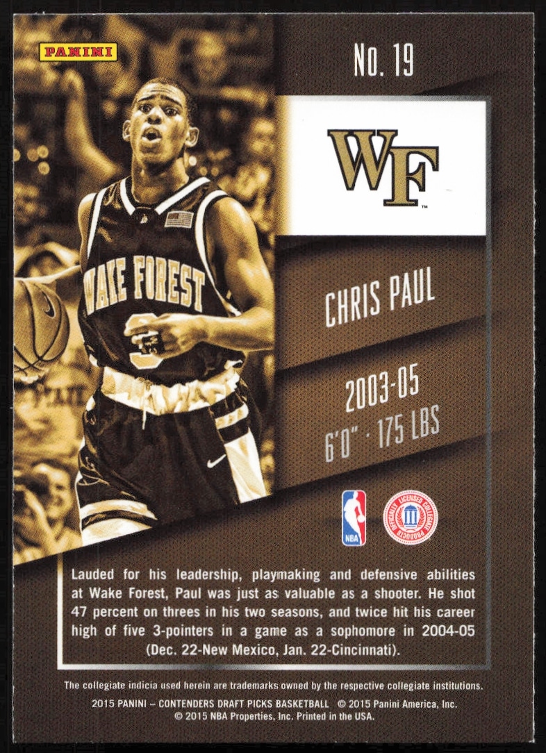 This Basketball card, from 2015-16 is part of the Panini Contenders Draft Picks card set. Chris Paul is featured and has a card number of 19.