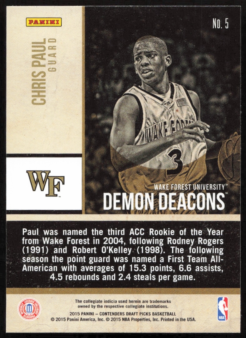 This Basketball card, from 2015-16 is part of the Panini Contenders Draft Picks card set. Chris Paul is featured and has a card number of 5.