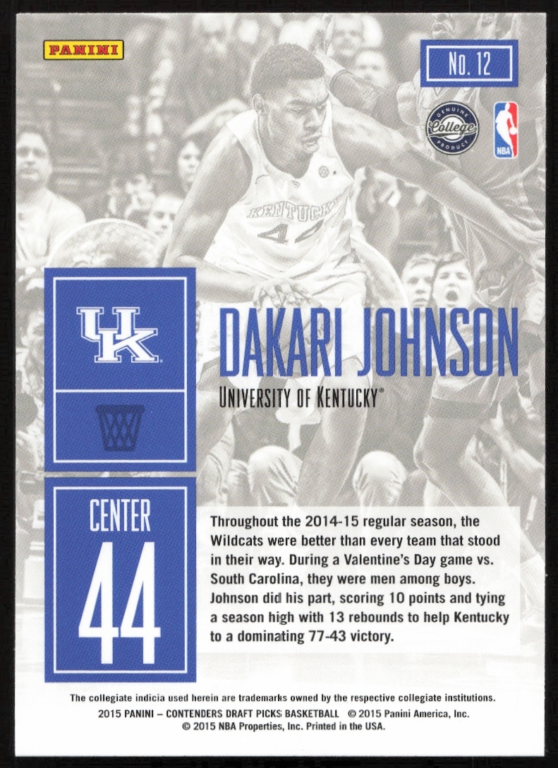 This Basketball card, from 2015-16 is part of the Panini Contenders Draft Picks card set. Dakari Johnson is featured and has a card number of 12.