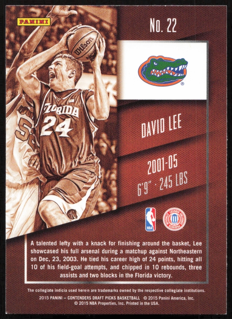 This Basketball card, from 2015-16 is part of the Panini Contenders Draft Picks card set. David Lee is featured and has a card number of 22.