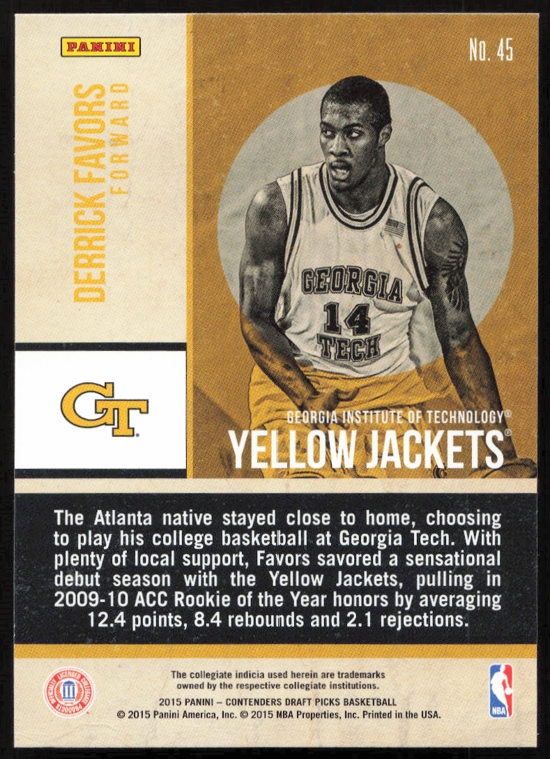 This Basketball card, from 2015-16 is part of the Panini Contenders Draft Picks card set. Derrick Favors is featured and has a card number of 45.