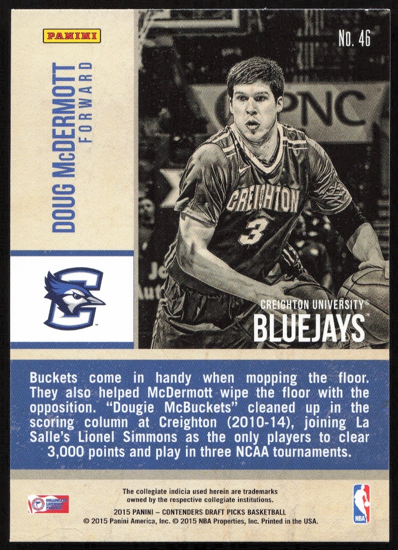 This Basketball card, from 2015-16 is part of the Panini Contenders Draft Picks card set. Doug McDermott is featured and has a card number of 46.