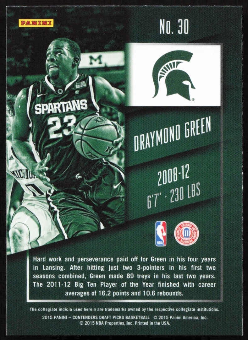 This Basketball card, from 2015-16 is part of the Panini Contenders Draft Picks card set. Draymond Green is featured and has a card number of 30.