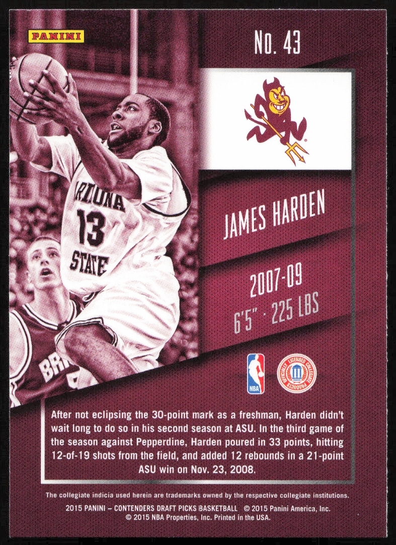This Basketball card, from 2015-16 is part of the Panini Contenders Draft Picks card set. James Harden is featured and has a card number of 43.