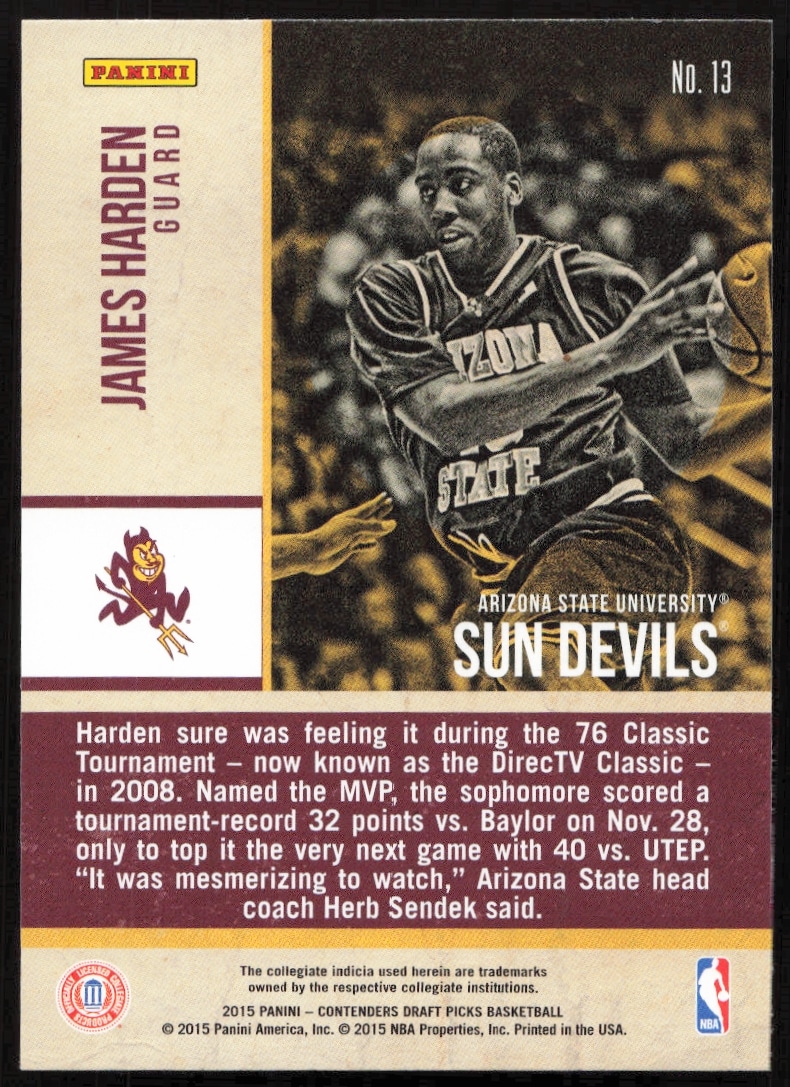 This Basketball card, from 2015-16 is part of the Panini Contenders Draft Picks card set. James Harden is featured and has a card number of 13.