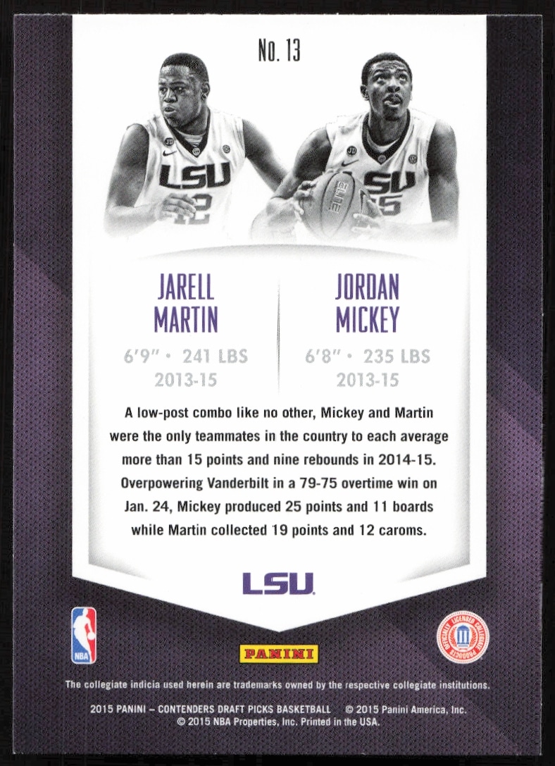 This Basketball card, from 2015-16 is part of the Panini Contenders Draft Picks card set. Jarell Martin / Jordan Mickey is featured and has a card number of 13.