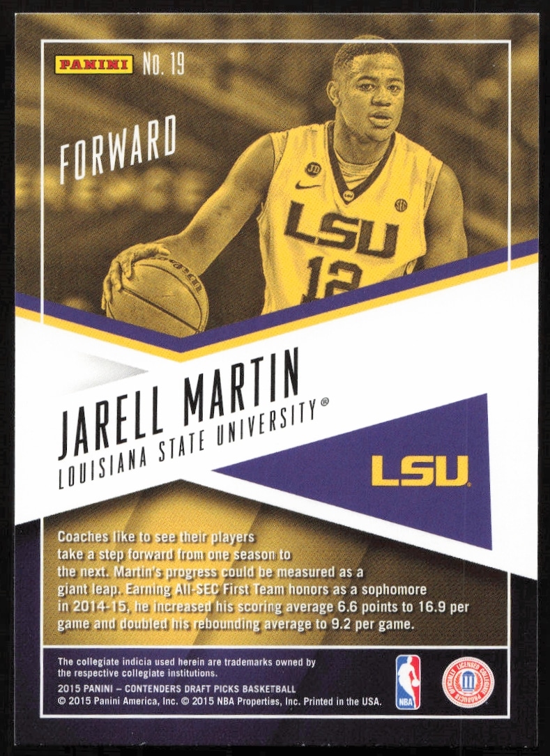 This Basketball card, from 2015-16 is part of the Panini Contenders Draft Picks card set. Jarell Martin is featured and has a card number of 19.