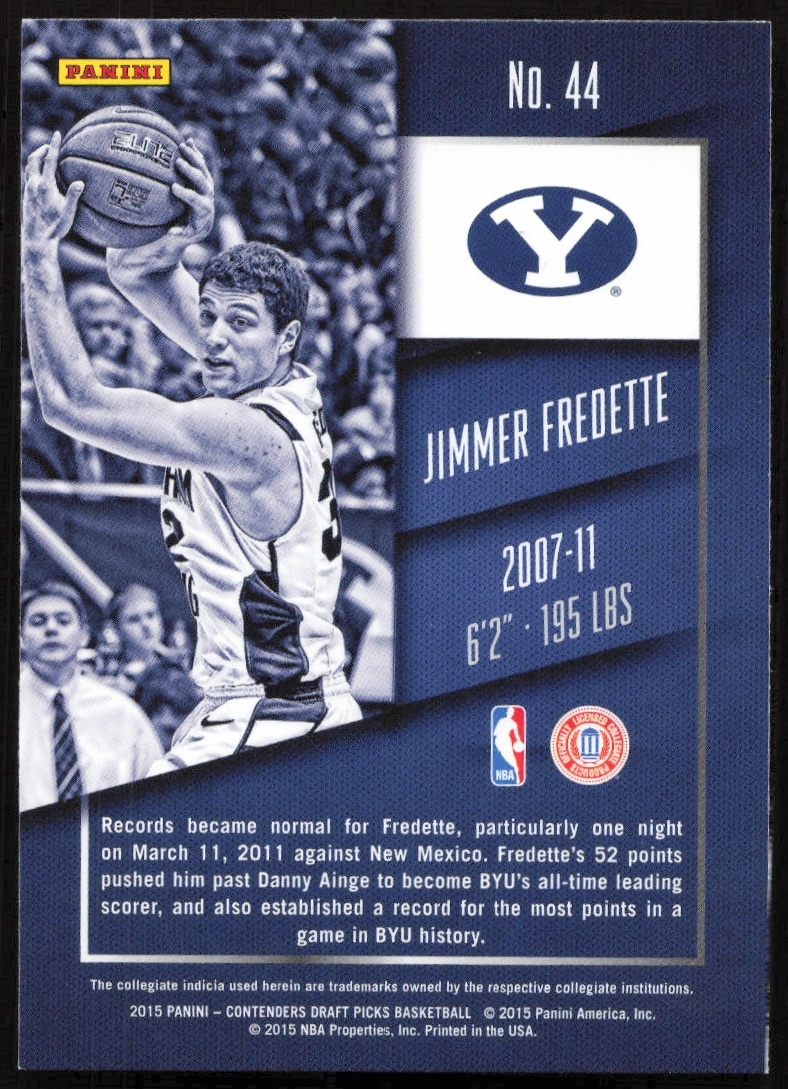 This Basketball card, from 2015-16 is part of the Panini Contenders Draft Picks card set. Jimmer Fredette is featured and has a card number of 44.