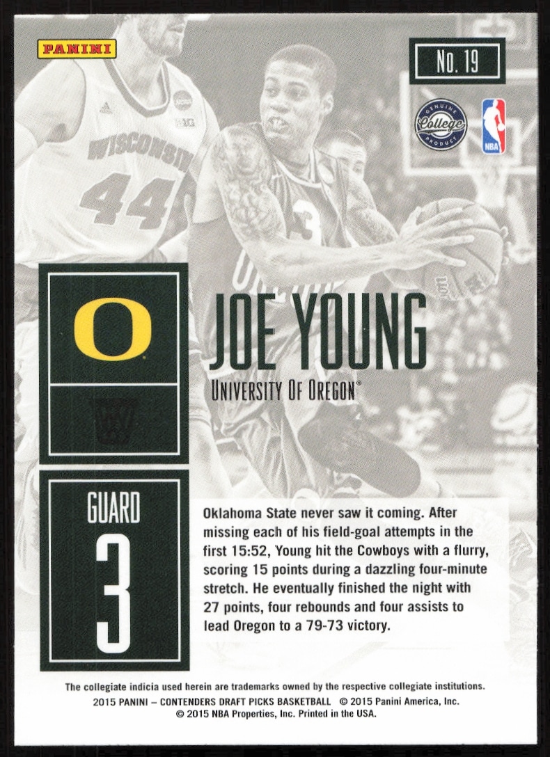 This Basketball card, from 2015-16 is part of the Panini Contenders Draft Picks card set. Joe Young is featured and has a card number of 19.