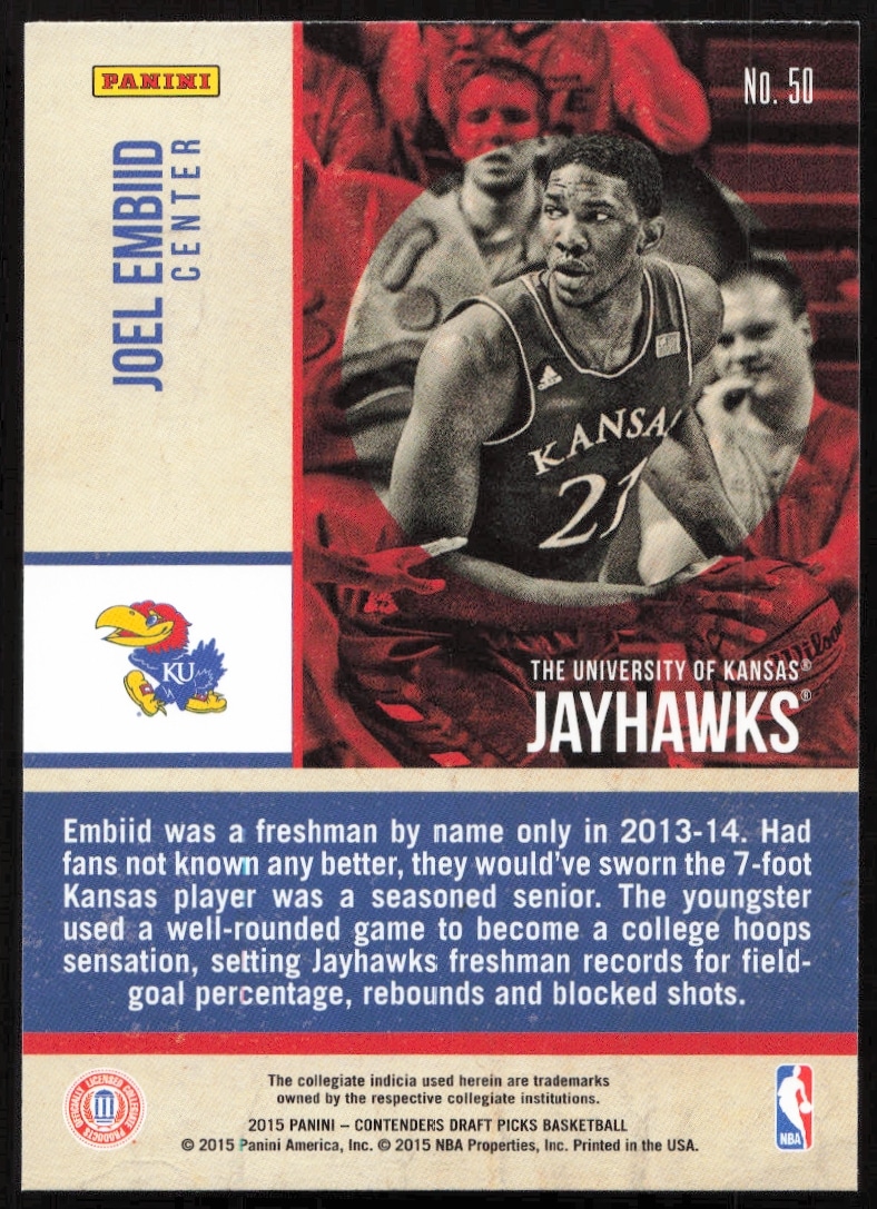 This Basketball card, from 2015-16 is part of the Panini Contenders Draft Picks card set. Joel Embiid is featured and has a card number of 50.
