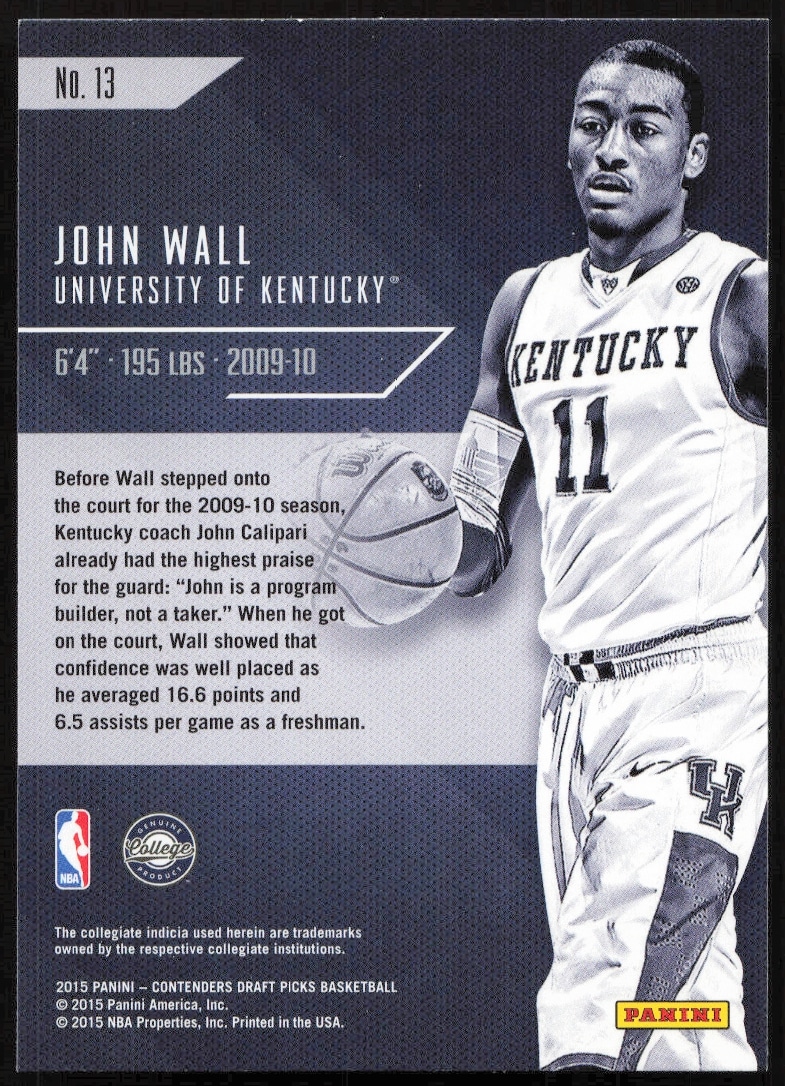 This Basketball card, from 2015-16-16 is part of the Panini Contenders Draft Picks card set. John Wall is featured and has a card number of 13.