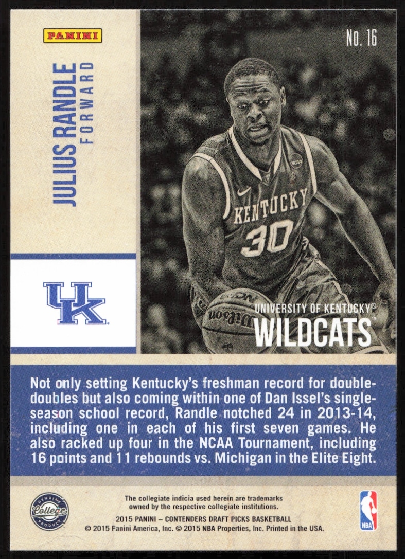 This Basketball card, from 2015-16 is part of the Panini Contenders Draft Picks card set. Julius Randle is featured and has a card number of 16.