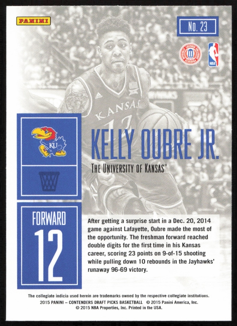 This Basketball card, from 2015-16 is part of the Panini Contenders Draft Picks card set. Kelly Oubre Jr. is featured and has a card number of 23.