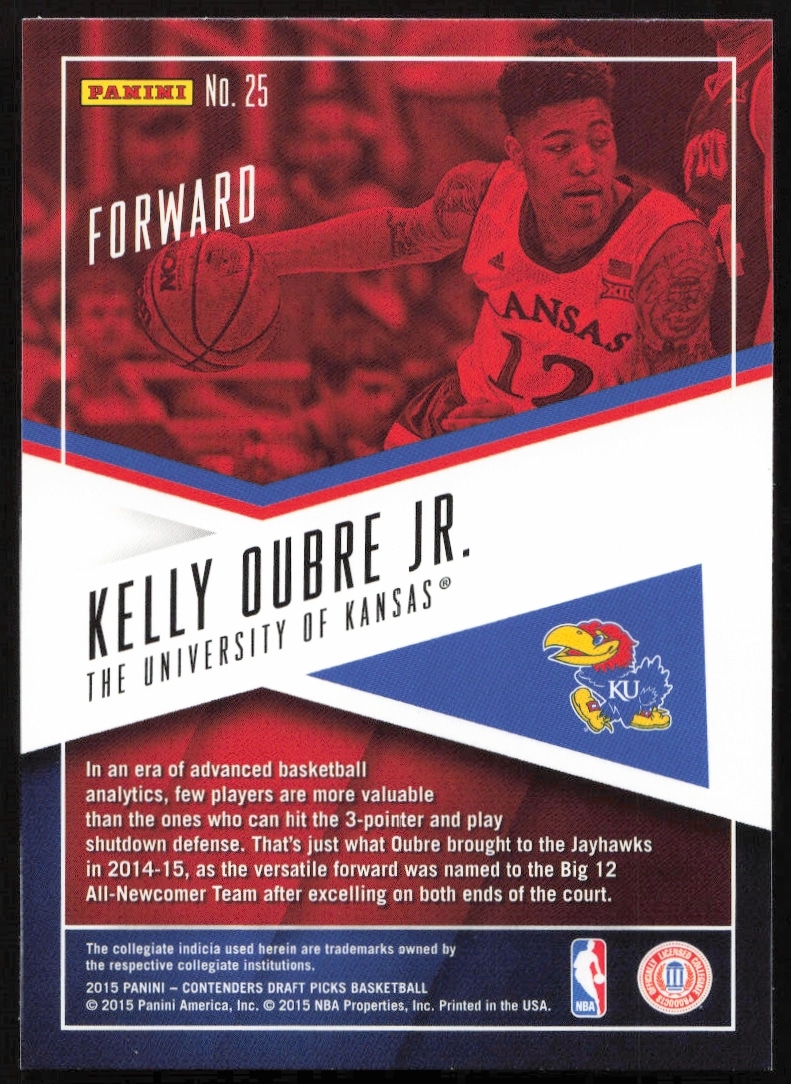 This Basketball card, from 2015-16 is part of the Panini Contenders Draft Picks card set. Kelly Oubre Jr. is featured and has a card number of 25.