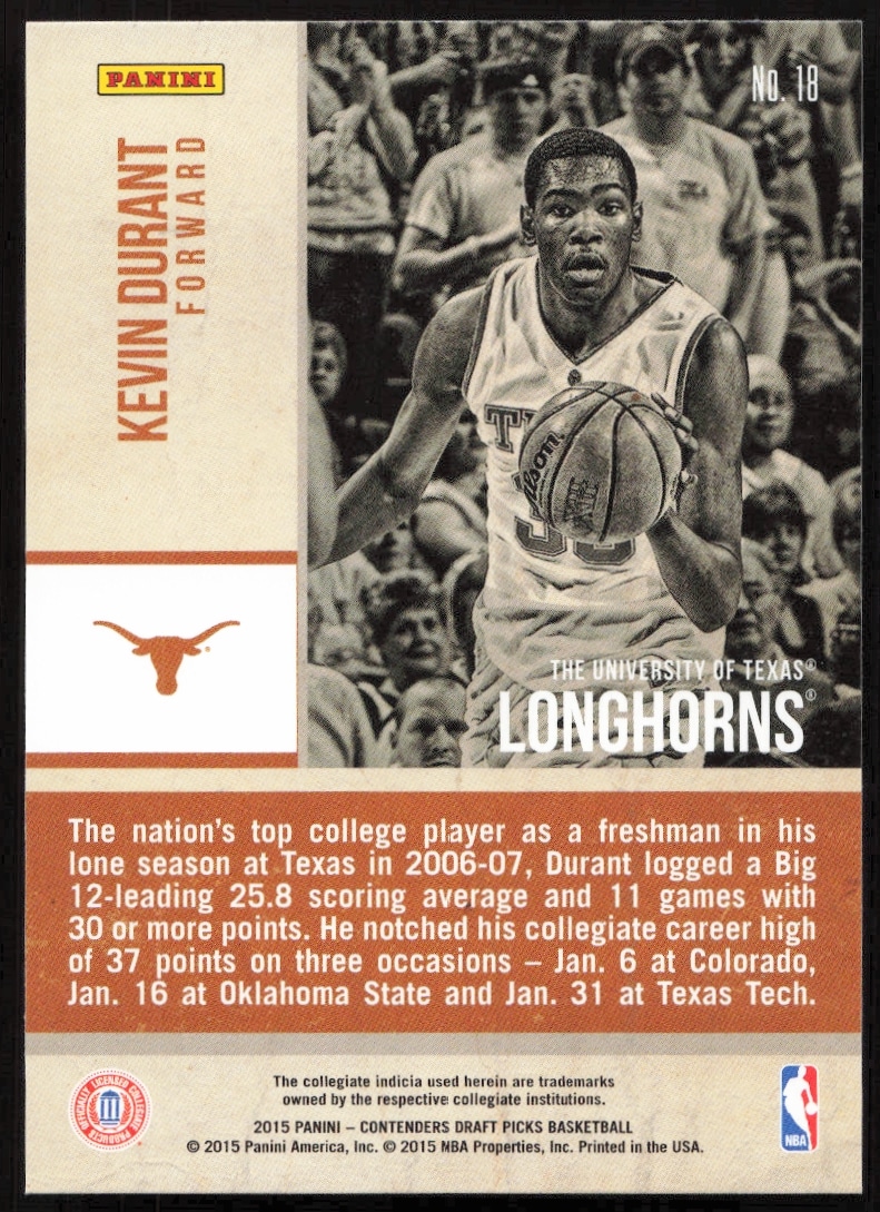 This Basketball card, from 2015-16 is part of the Panini Contenders Draft Picks card set. Kevin Durant is featured and has a card number of 18.