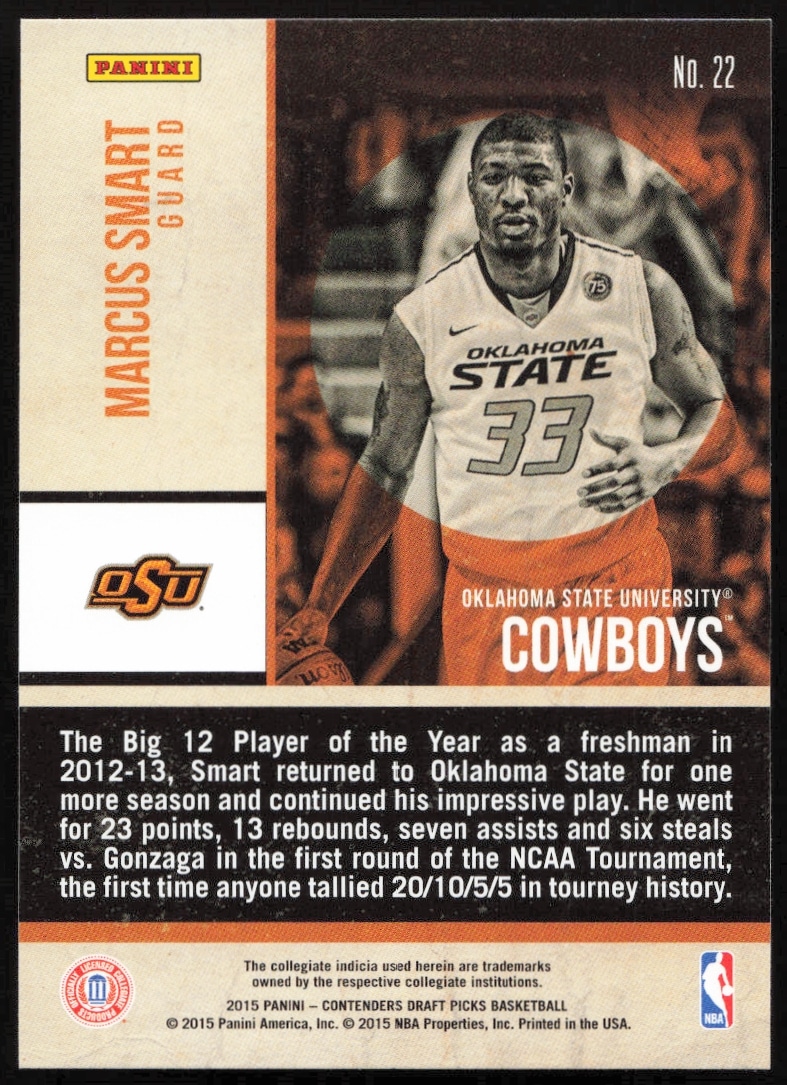 This Basketball card, from 2015-16 is part of the Panini Contenders Draft Picks card set. Marcus Smart is featured and has a card number of 22.