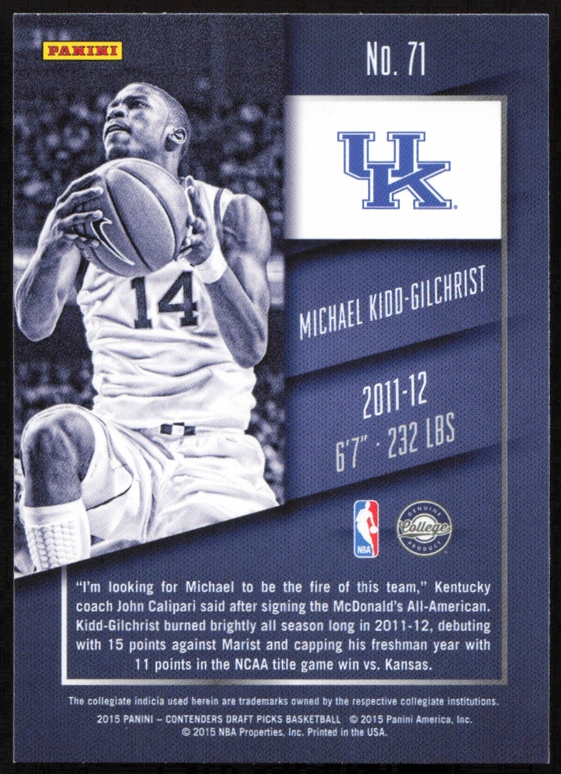 This Basketball card, from 2015-16 is part of the Panini Contenders Draft Picks card set. Michael Kidd-Gilchrist is featured and has a card number of 71.