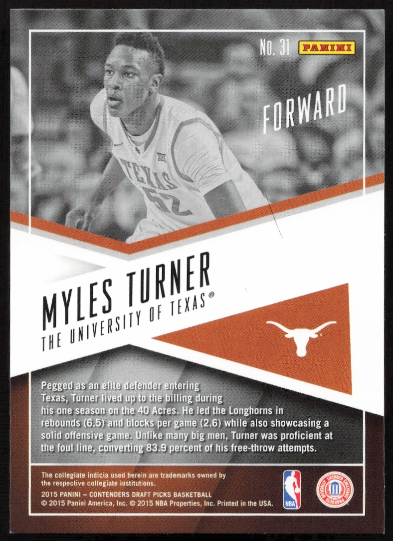 This Basketball card, from 2015-16 is part of the Panini Contenders Draft Picks card set. Myles Turner is featured and has a card number of 31.