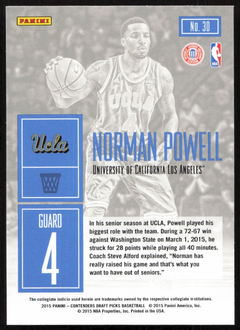 This Basketball card, from 2015-16 is part of the Panini Contenders Draft Picks card set. Norman Powell is featured and has a card number of 30.