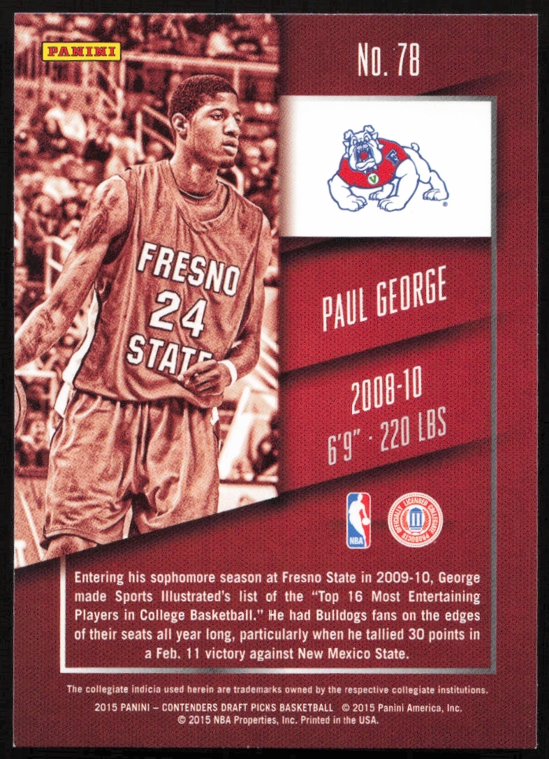 This Basketball card, from 2015-16 is part of the Panini Contenders Draft Picks card set. Paul George is featured and has a card number of 78.